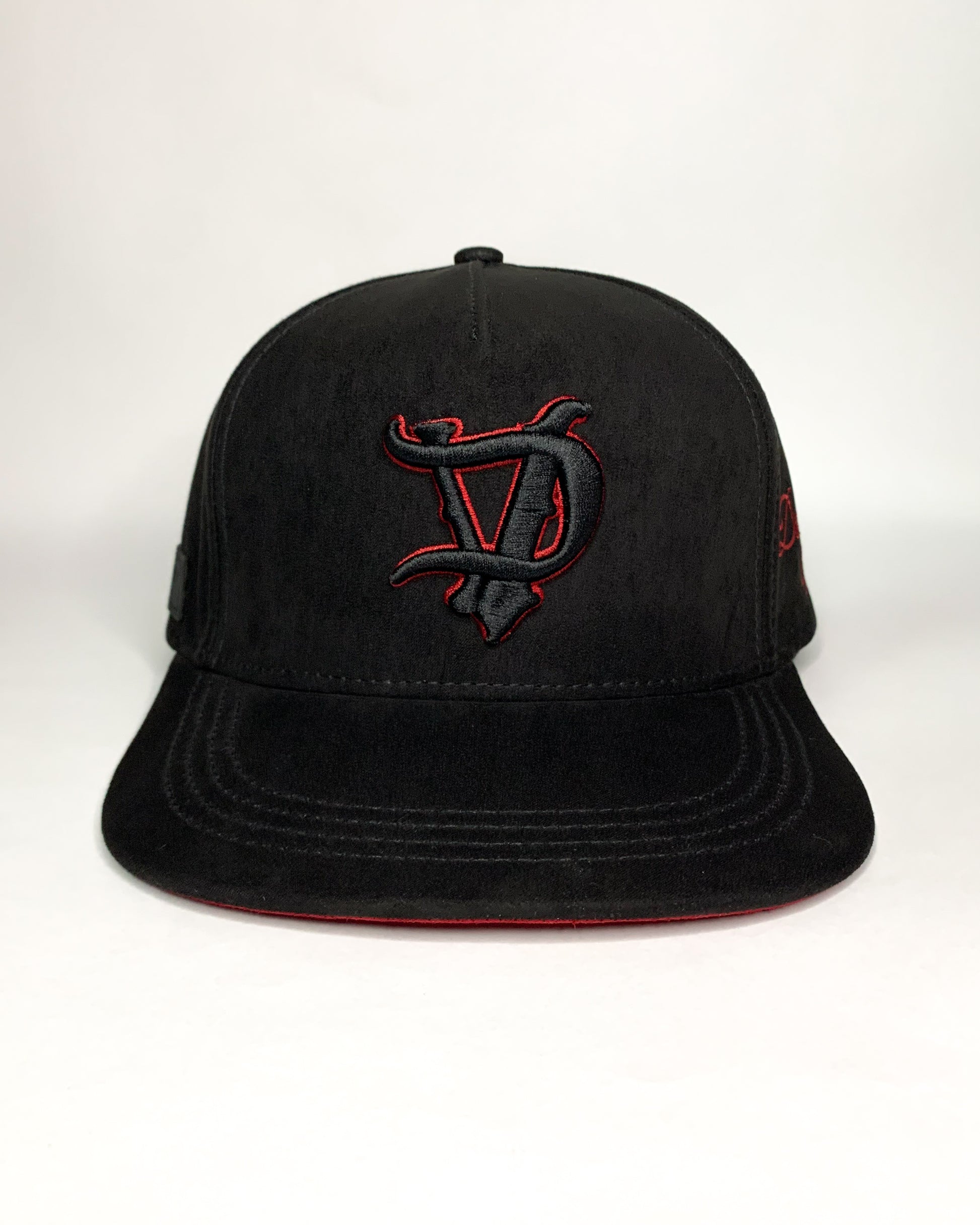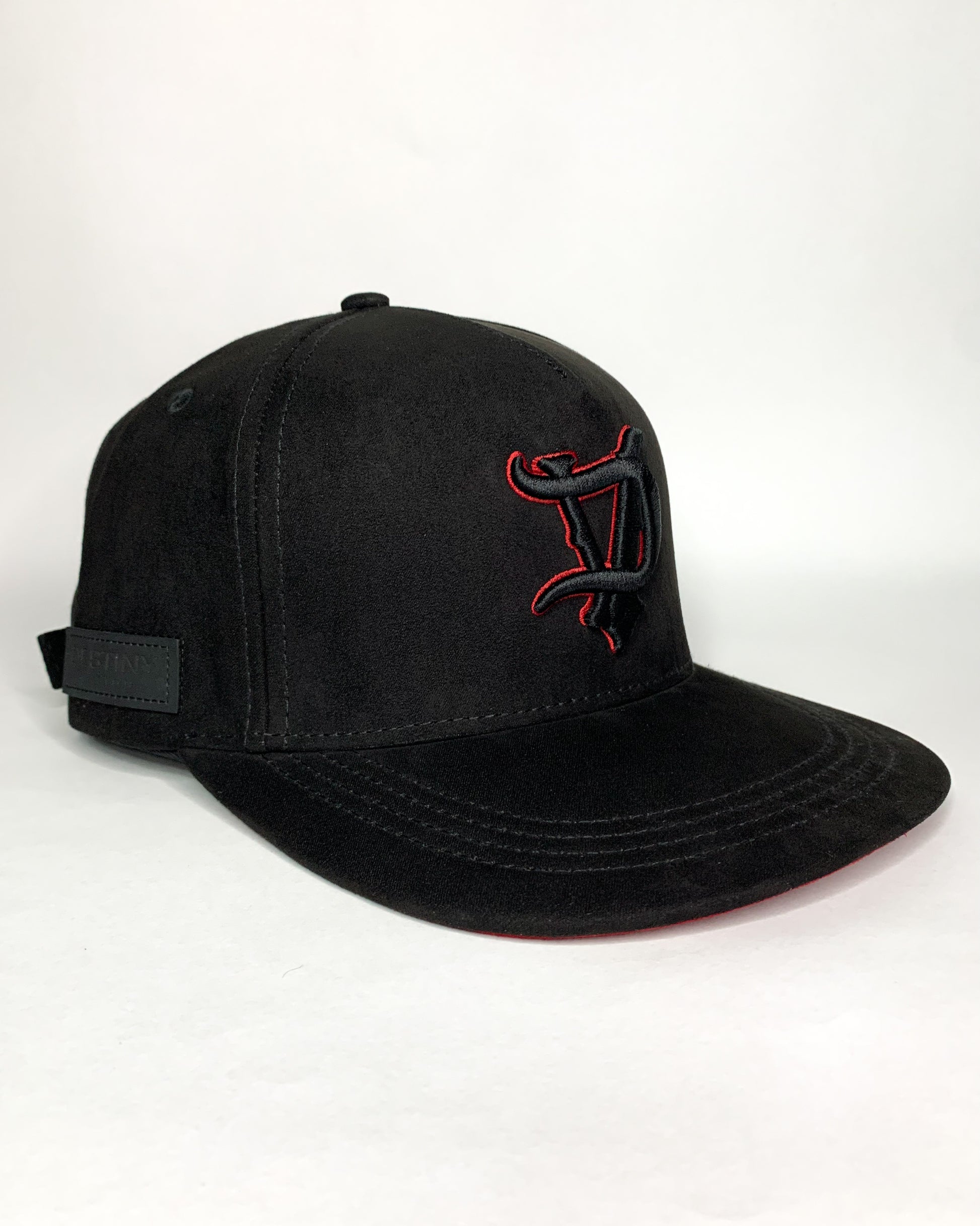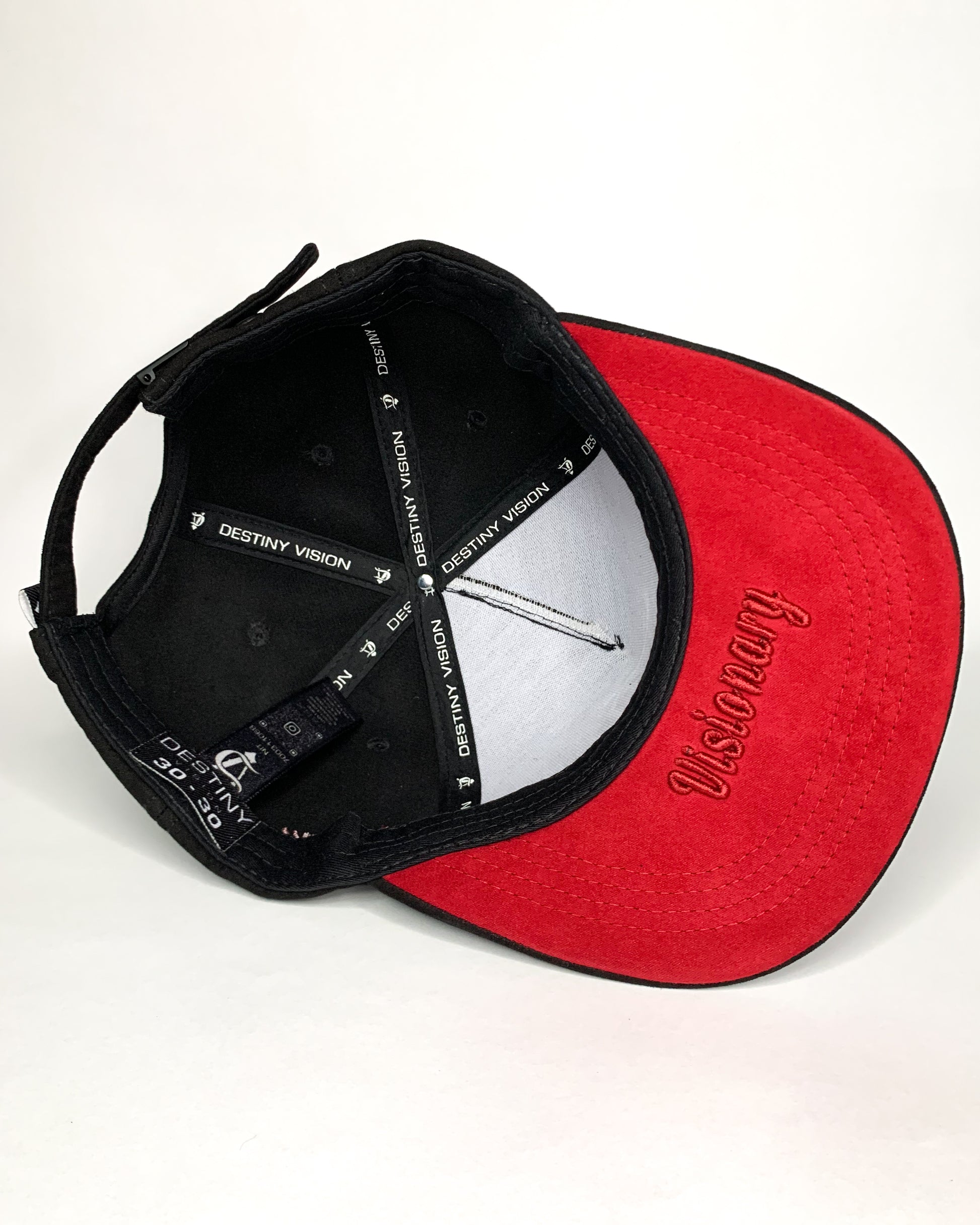Gorra ajustable de color negro con visera inferior rojo 100% gamuza original con Iniciales frontal en alto relieve, hebilla marcada ,Marquillas interior y exterior, cesgo marcado y grabado en cuero por el lateral izquierdo y firma bordada por lateral derecho.