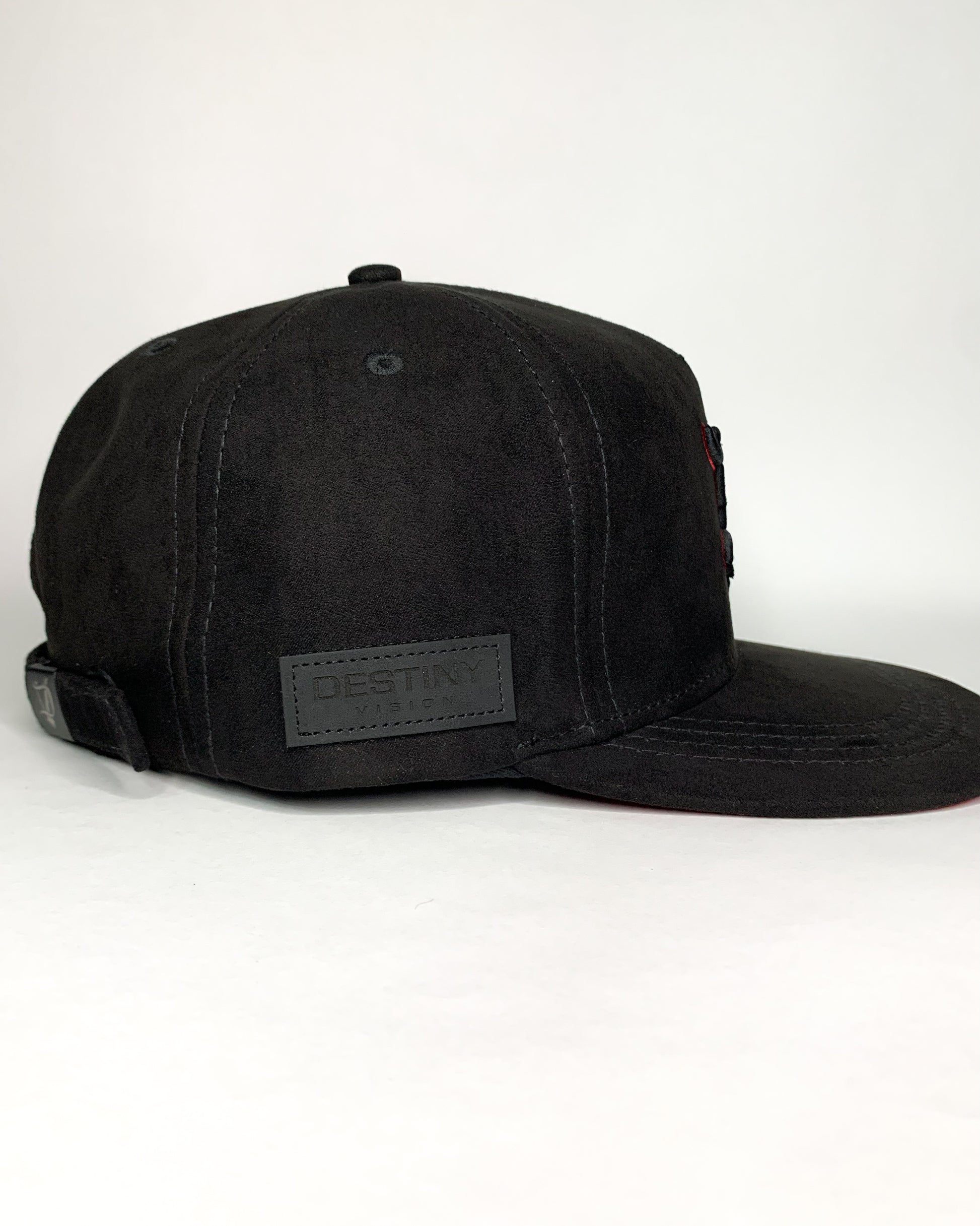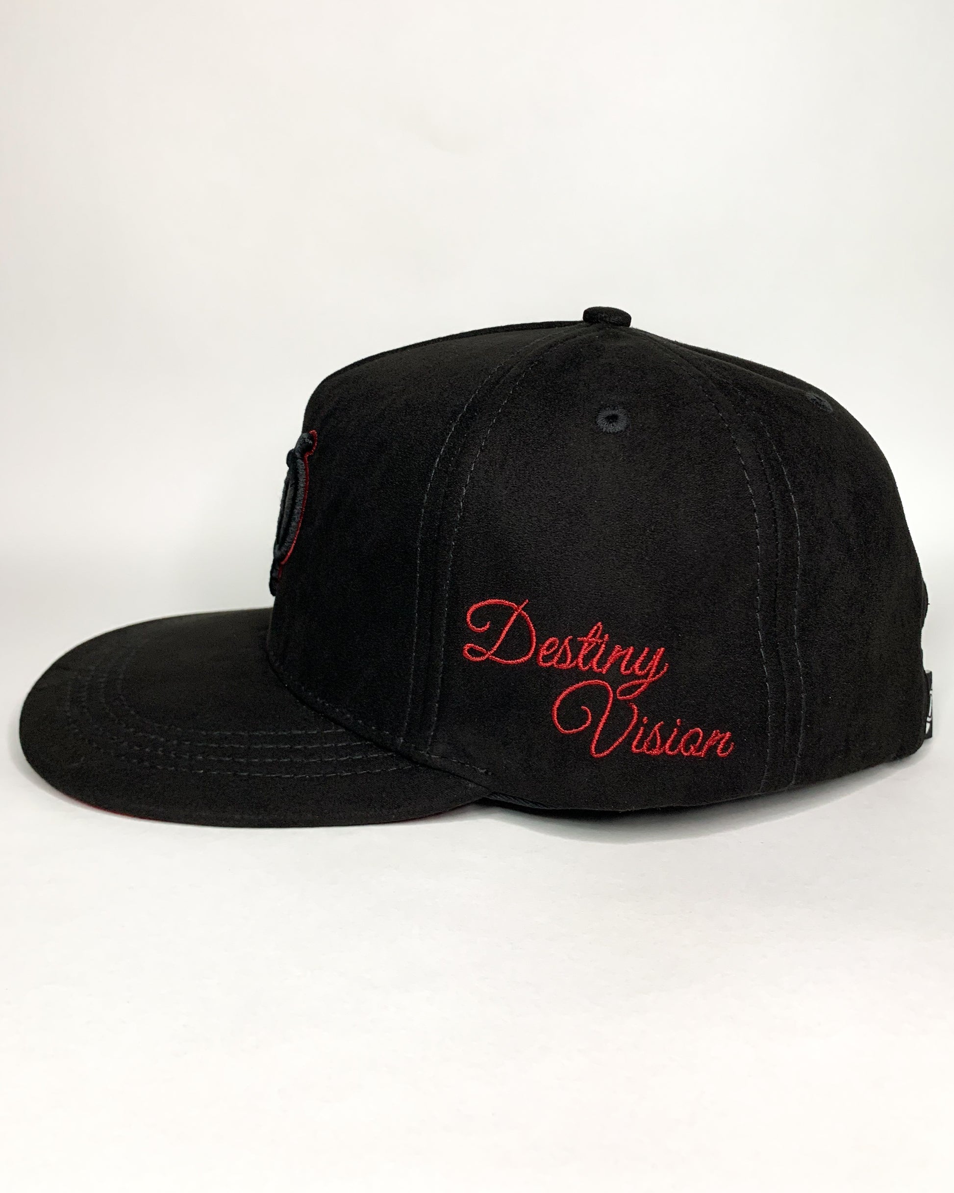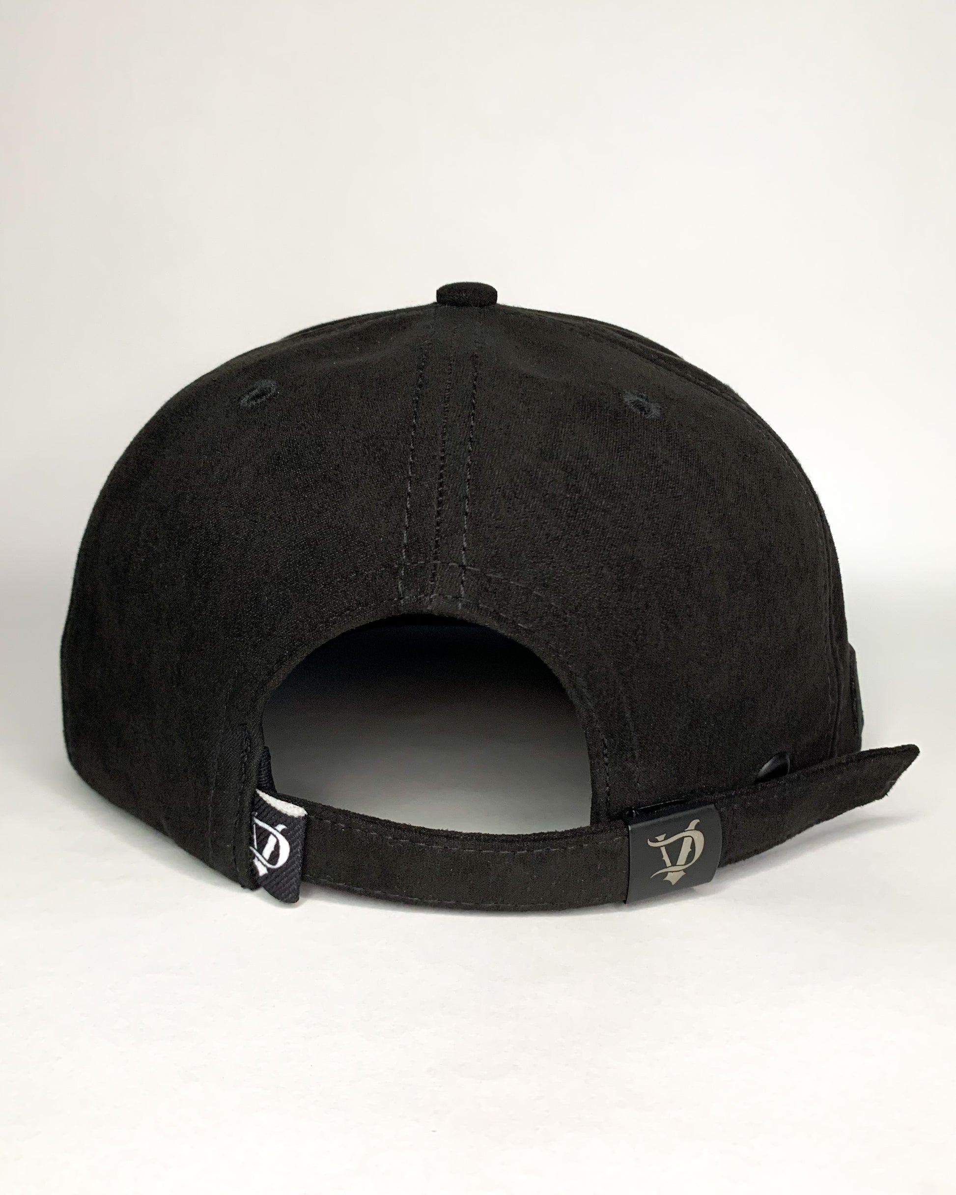 Gorra ajustable de color negro con visera inferior rojo 100% gamuza original con Iniciales frontal en alto relieve, hebilla marcada ,Marquillas interior y exterior, cesgo marcado y grabado en cuero por el lateral izquierdo y firma bordada por lateral derecho.
